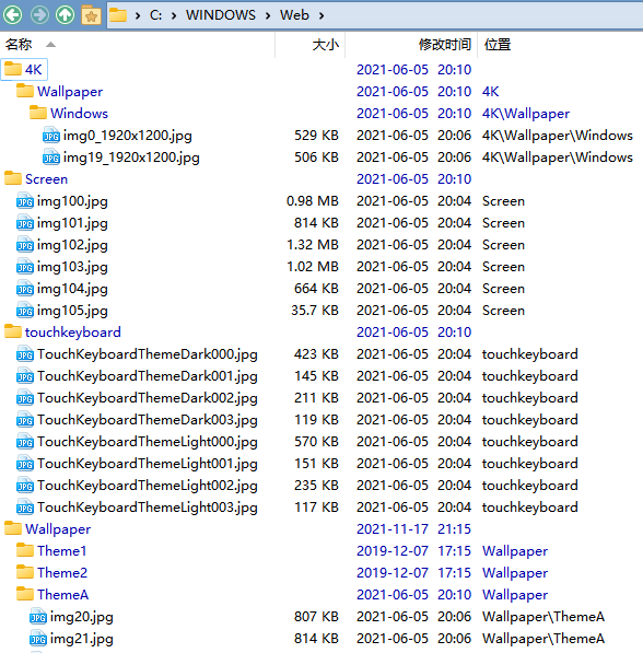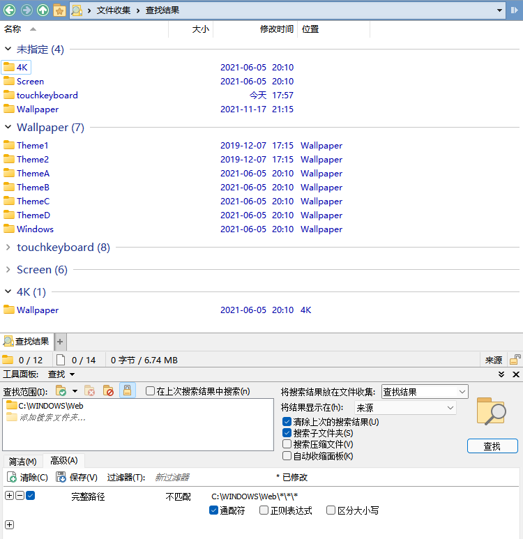 例如,如果我们要显示在 `C:\WINDOWS\Web` 下深度小于等于 1(`Web` 目录下的文件深度为 0)的文件,我们可以通过查找路径**不匹配** `C:\WINDOWS\Web\*\*\*`(或 `*\*\*\*\*\*`)的文件来实现。如图所示: