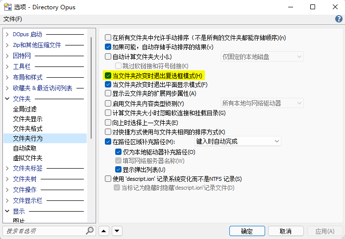 默认配置下,在切换文件夹时 DOpus 会自动关闭复选框模式,如果希望在切换文件夹时保留复选框模式,可以取消勾选 `配置 > 文件夹 > 文件夹行为 > 当文件夹改变时退出复选框模式`: