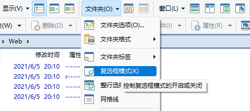 复选框模式可以通过 `“菜单”工具栏 > 文件夹 > 复选框模式` 或 <kbd><kbd>Alt</kbd>+<kbd>O</kbd>, <kbd>K</kbd></kbd>(英文下为 <kbd><kbd>Alt</kbd>+<kbd>O</kbd>, <kbd>C</kbd></kbd>)来开启和关闭: