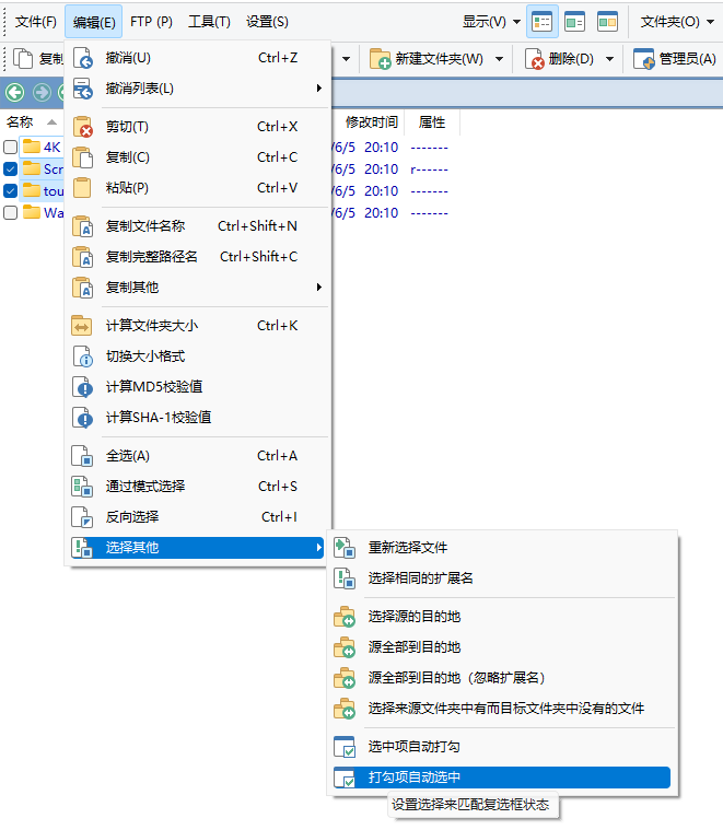 当启用复选框模式时,被触发的按钮和快捷键会对**勾选的所有文件**执行操作(而不是选中的文件)。但要注意的是,上下文菜单仍然只对选中的文件执行操作。如果想要让上下文菜单对勾选的所有文件执行操作,可以先通过 `“菜单”工具栏 > 编辑 > 选择其他 > 打勾项自动选中` 选中所有文件,再触发上下文菜单进行操作: