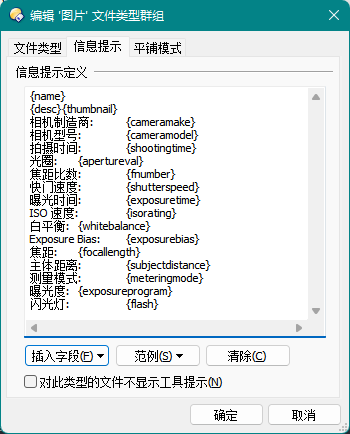 信息提示的内容与具体的文件类型有关,各个文件类型的信息提示格式可在文件类型编辑器中修改: