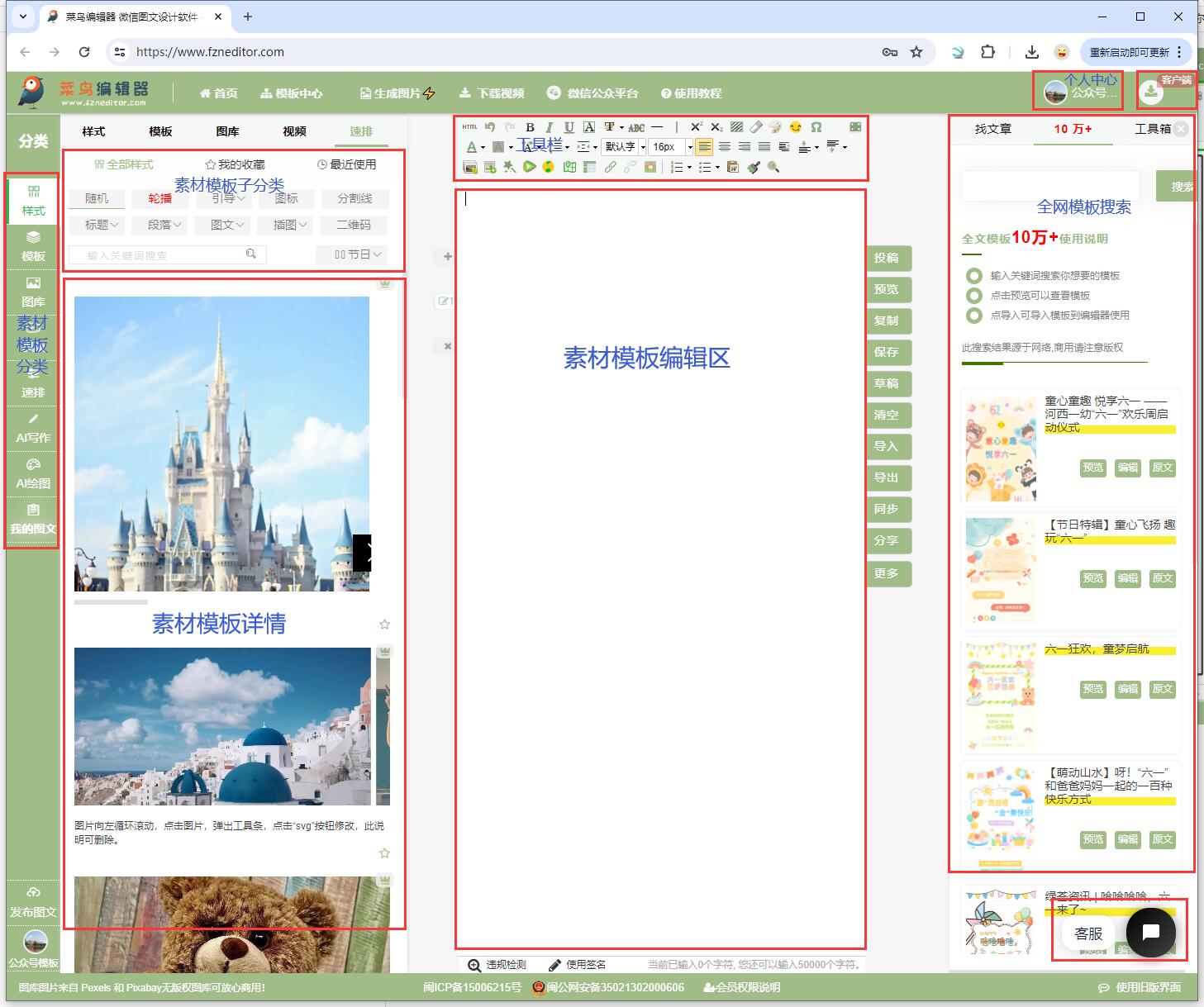 3.素材模板详情,模板显示区,点击素材模板会自动进入右边编辑器