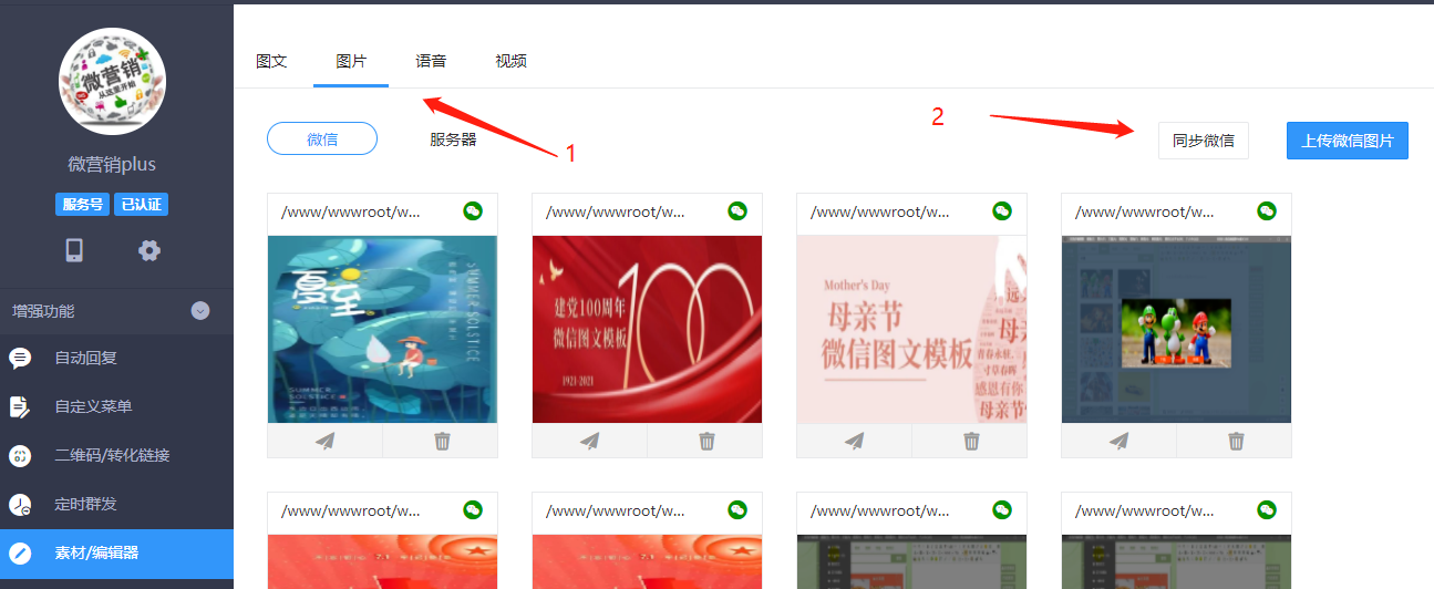 素材/编辑器点击图片,然后点击同步微信,就会自动同步微信公众平台的图片过来
