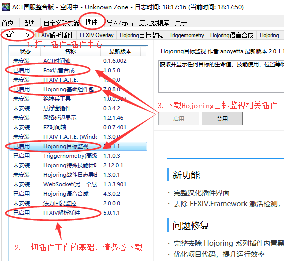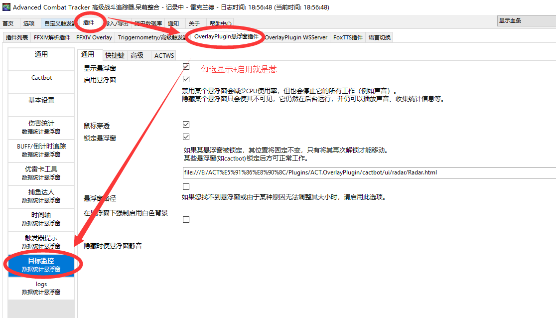 呆萌ACT是整合过的,默认直接可用,如果没有的话尝试下载好并打开ACT找到 **插件-悬浮窗插件-目标监控** 勾选显示+启用便是。