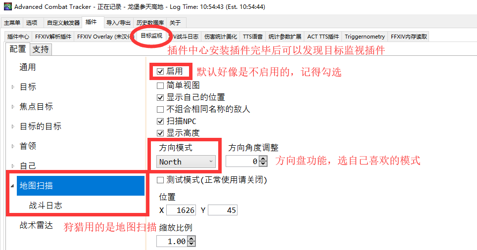 目标监视能实时提供监测目标的坐标,但是会被陆行鸟和人名干扰,仅支持DX11,DX9用户请看ACT自带 自定义触发器。