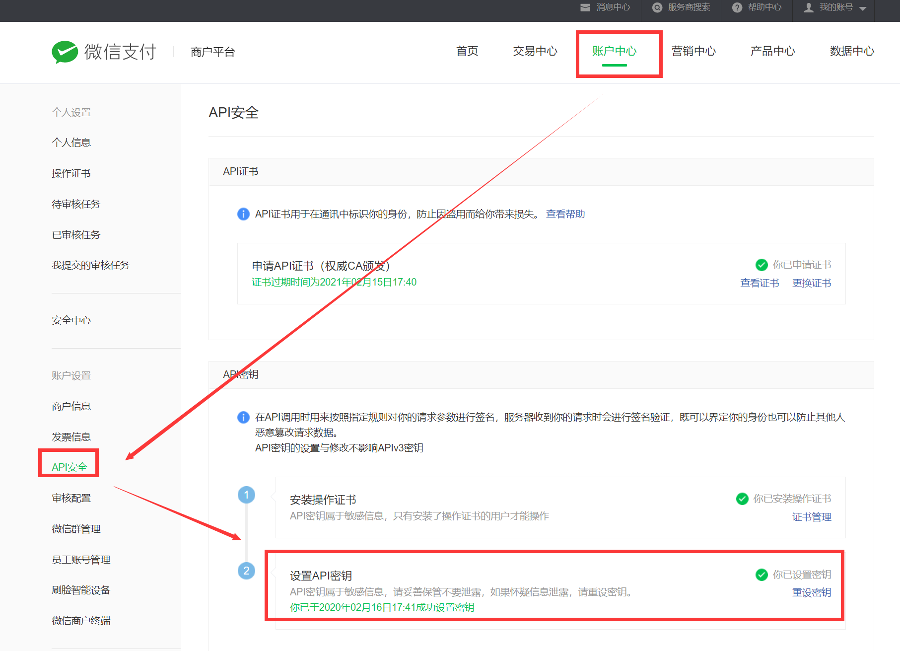 支付密钥位置(登录微信支付商户官方后台[https://pay.weixin.qq.com/](https://pay.weixin.qq.com/))
