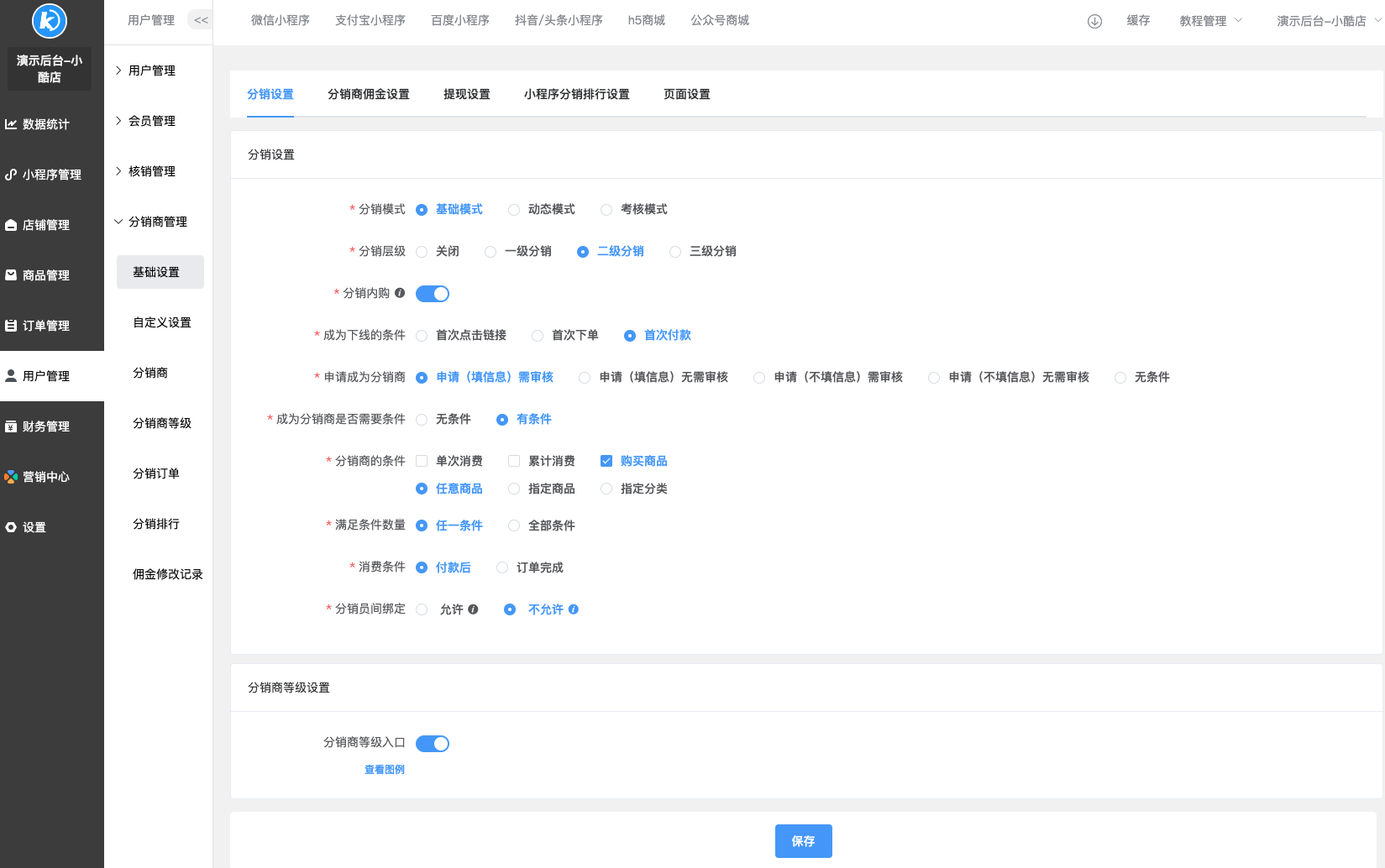 * 分销层级:设置分销层级(不开启,1级,2级,3级,仅自购),是若不开启,则无法使用分销功能