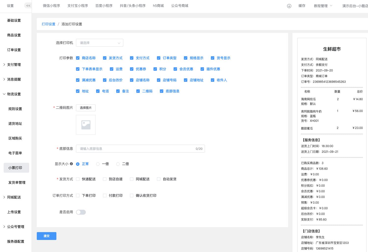 **用处:**连接打印机后, 在买家下单、付款、确认收货的时候打印小票。