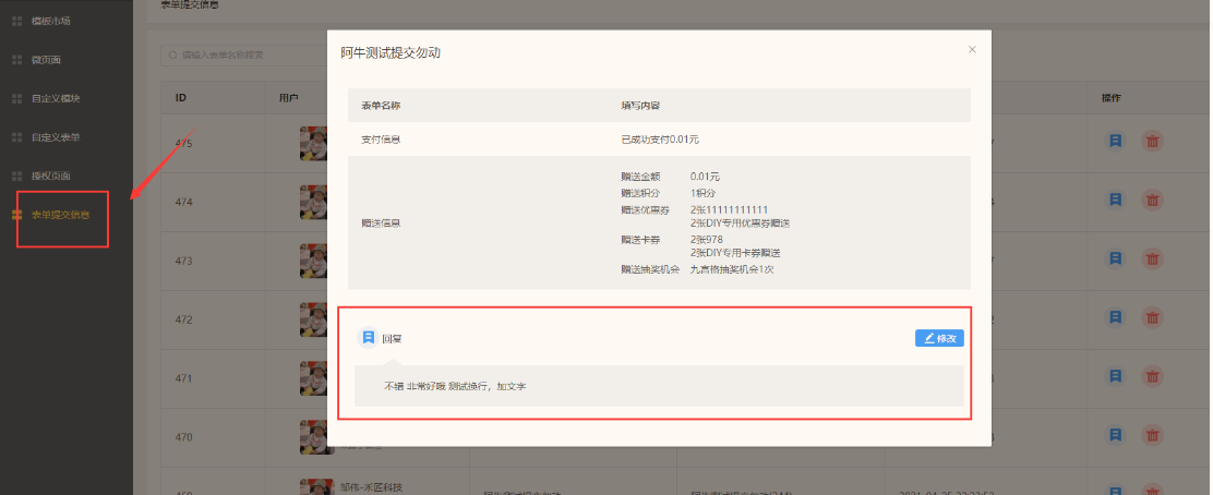 提交前/提交后台动作,支持二次提交提示,支持提交赠送积分,余额,优惠券,卡券,会员,抽奖次数,支持提交后跳转页面