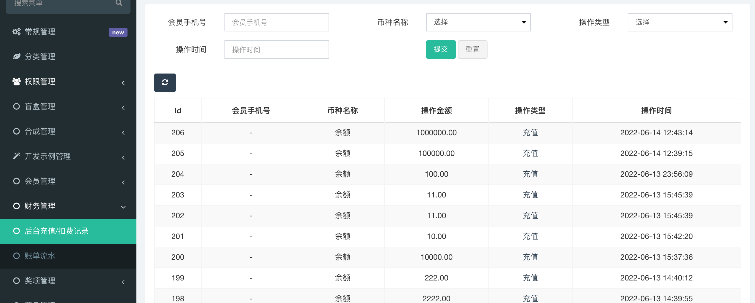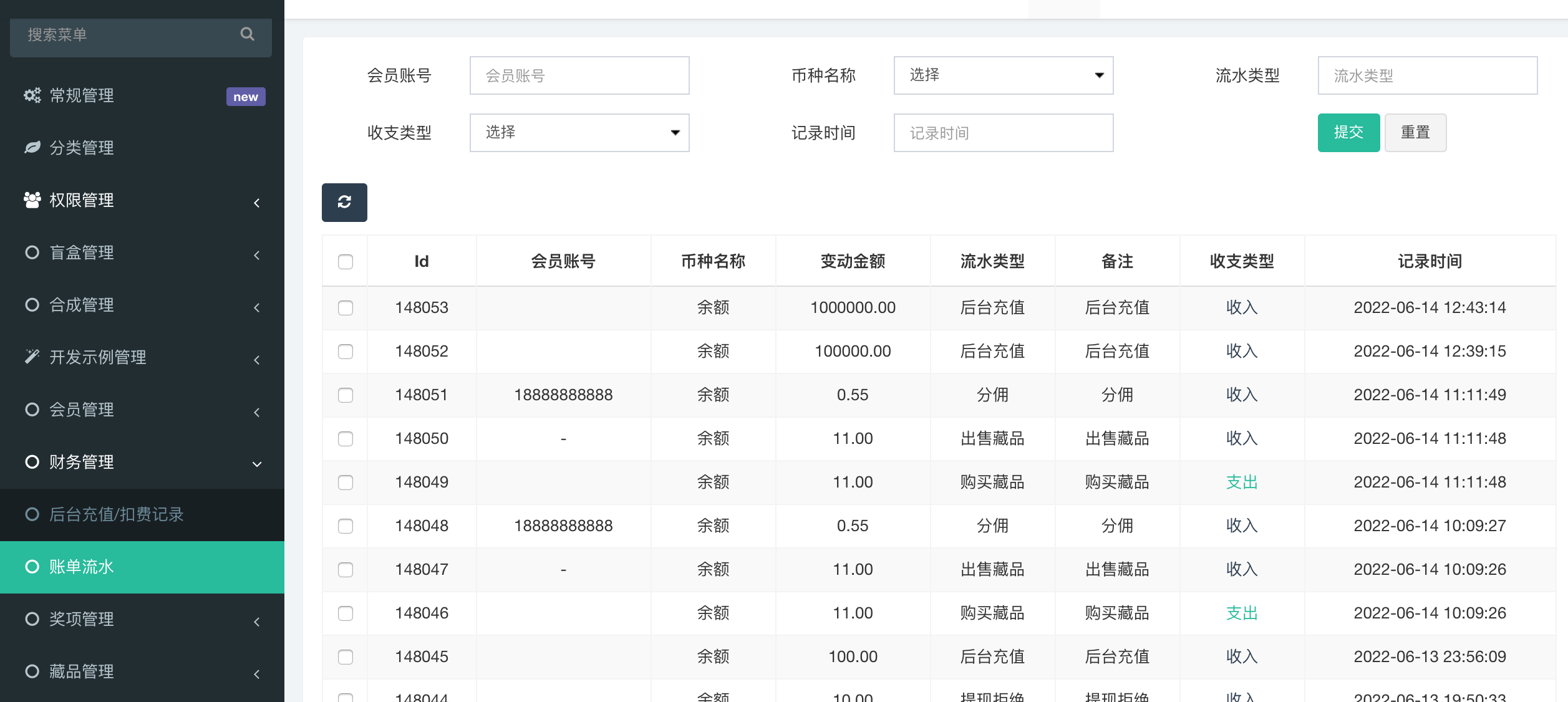 1、后台充值扣费记录 可统计通过后台给用户充值和扣费的记录  2、账单流水 可统计用户充值、购买藏品、分佣等账单流水