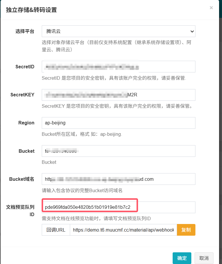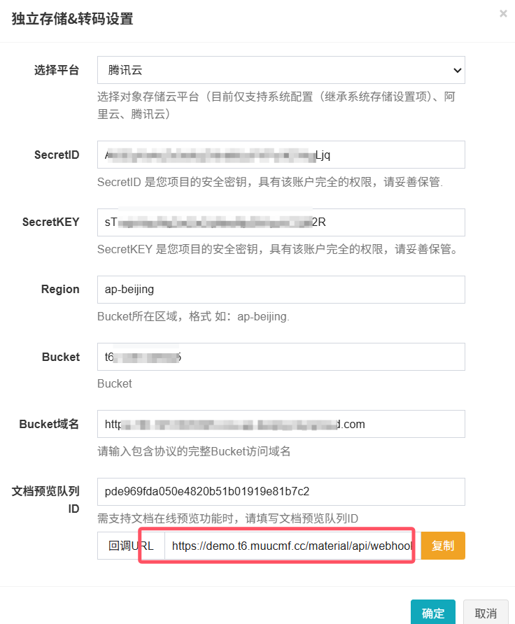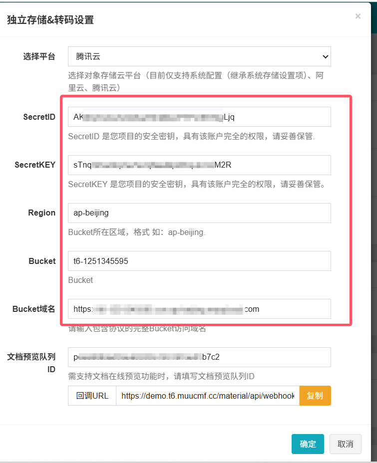 将上述参数依次填入MuuCmf内腾讯云存储对应位置中,【确定】后即可完成配置
