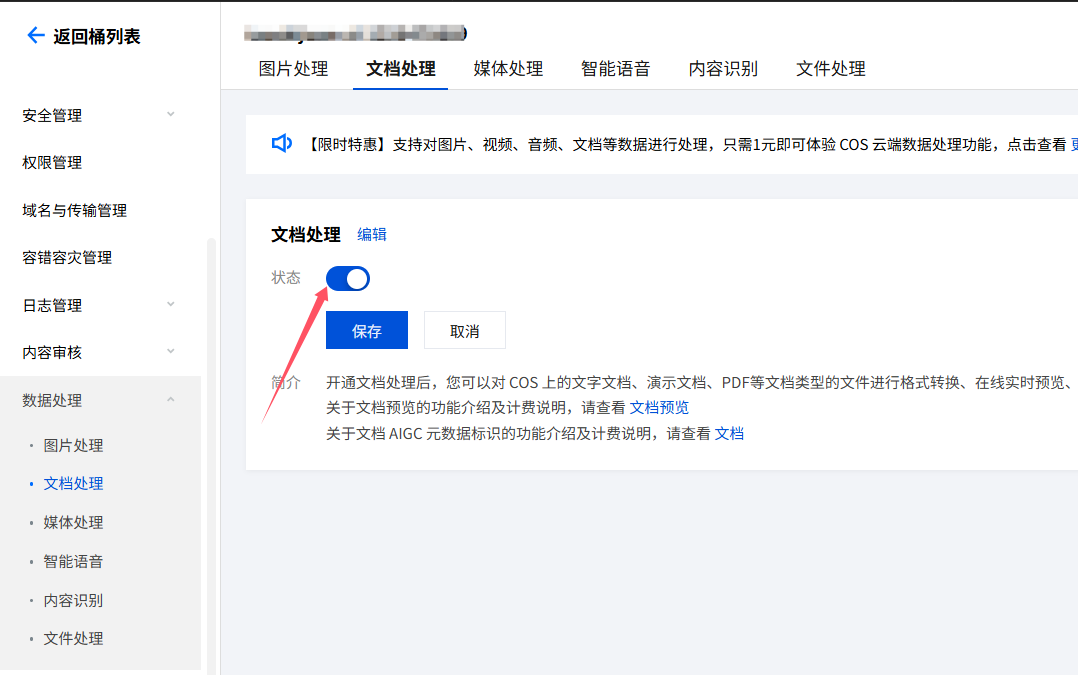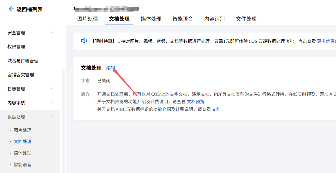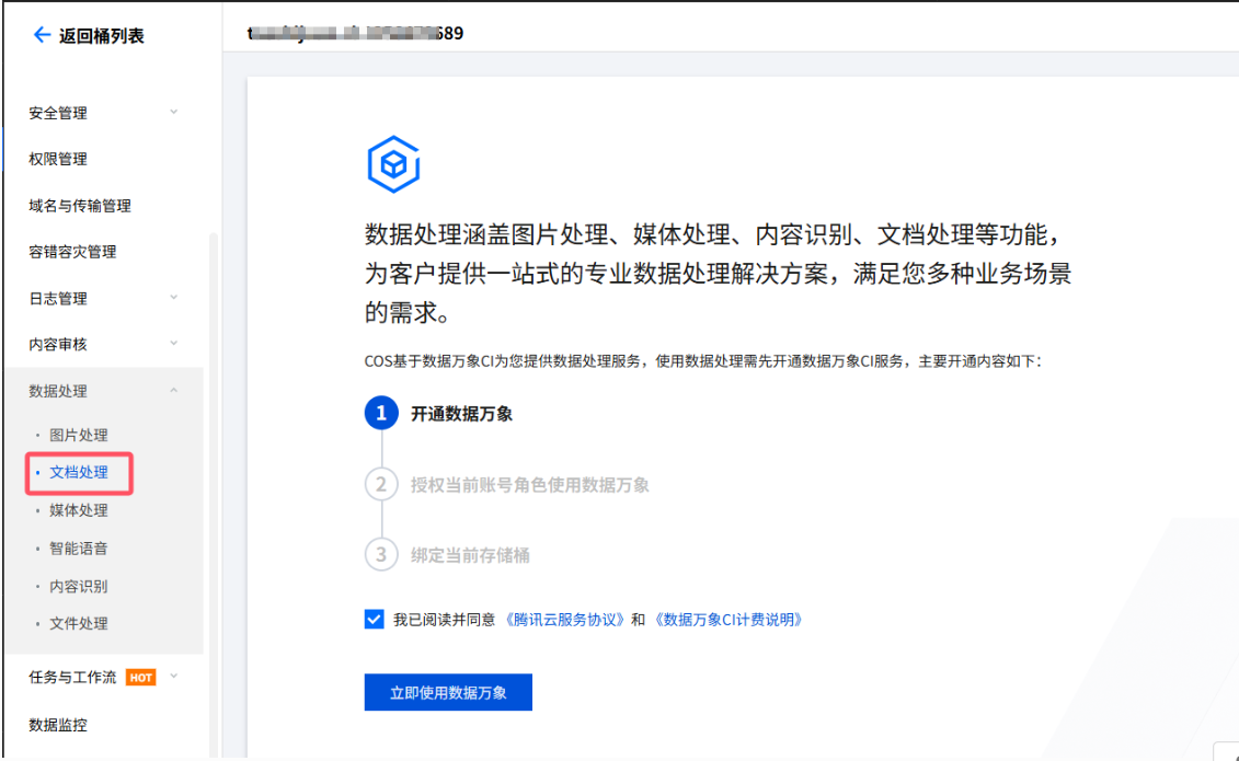 在腾讯云云存储-进入刚刚为资料下载新创建的存储桶,点击数据处理-文档处理,点击立即使用数据万象。