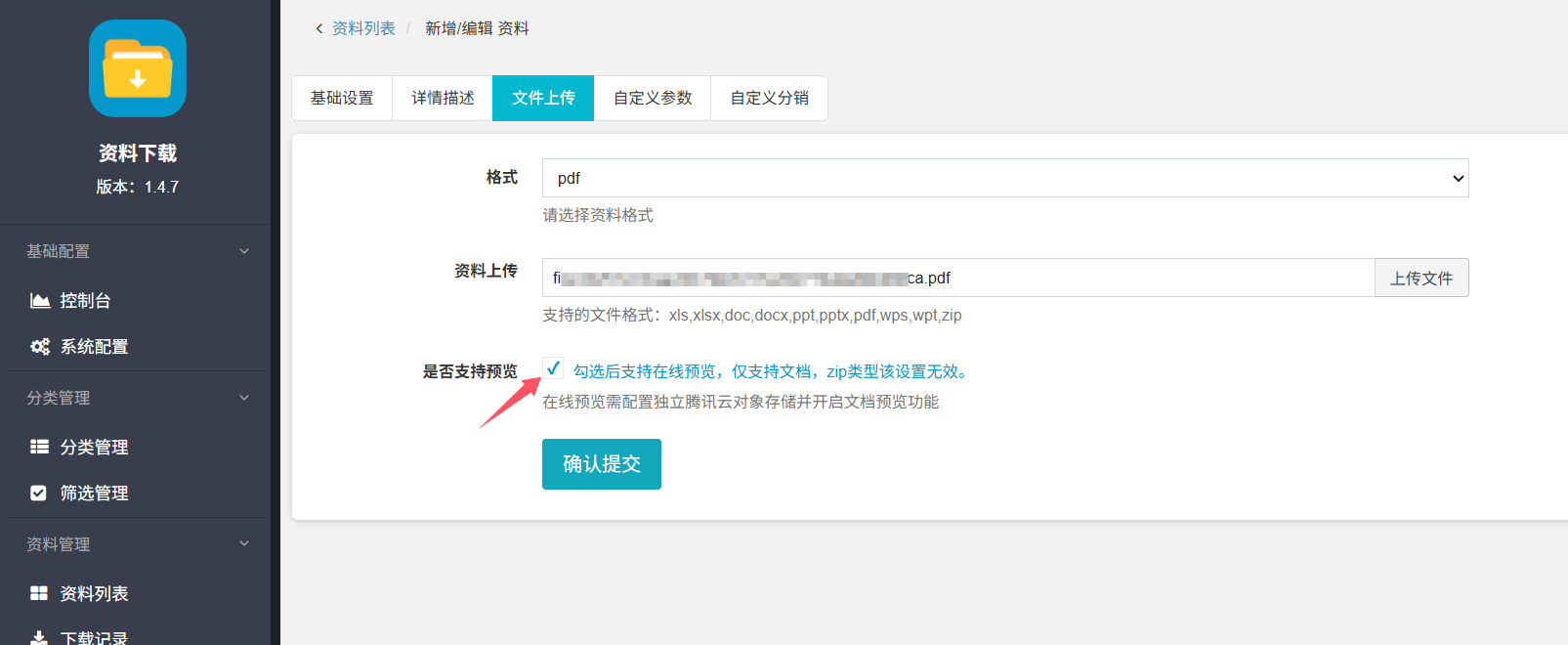 然后在资料编辑页-文件上传里勾选支持预览即可实现在订阅资料后在线预览文件的功能。