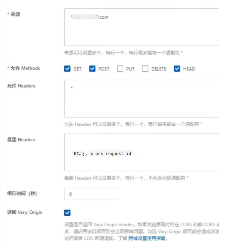 * **按下方截图填写跨域配置参数**,注意:【来源】填写您的一级域名前面加“ \* ”,【暴露Headers】填写:ETag, x-oss-request-id,【返回Vary】要做勾选,填写后确定提交即可。