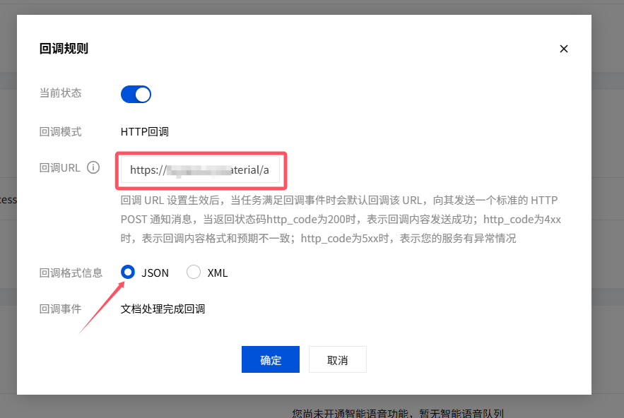 将刚刚复制的回调URL粘贴进去,回调格式信息勾选JSON,确定保存即可。