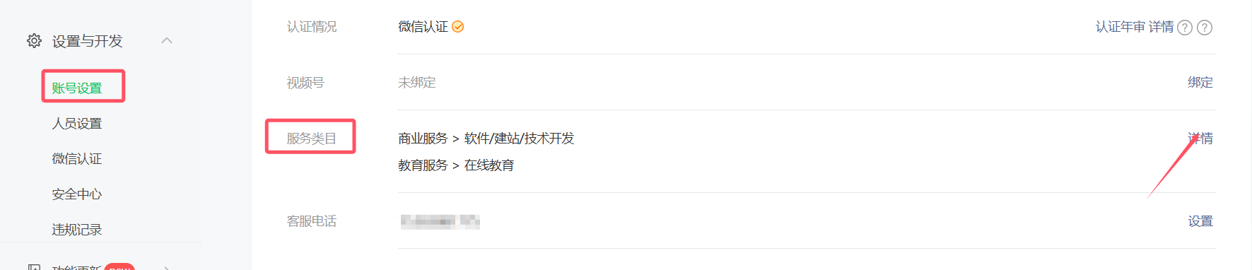 1、登录微信公众平台-设置与开发-账号设置-服务类目,点击右侧详情添加类目
