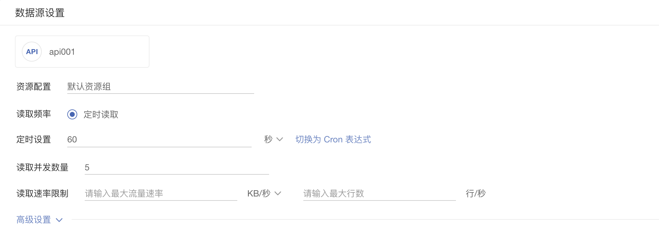 * 定时设置:用户可以设置读取间隔时间,支持cron表达式。**需要注意的地方**:如果在用户设置的期间内没有完成读写操作,则系统会等到写入完成后才会开启下次读取。如果在用户设置的期间内完成了读写操作,则系统会按照用户设置的定时设置间隔开启下次读取。