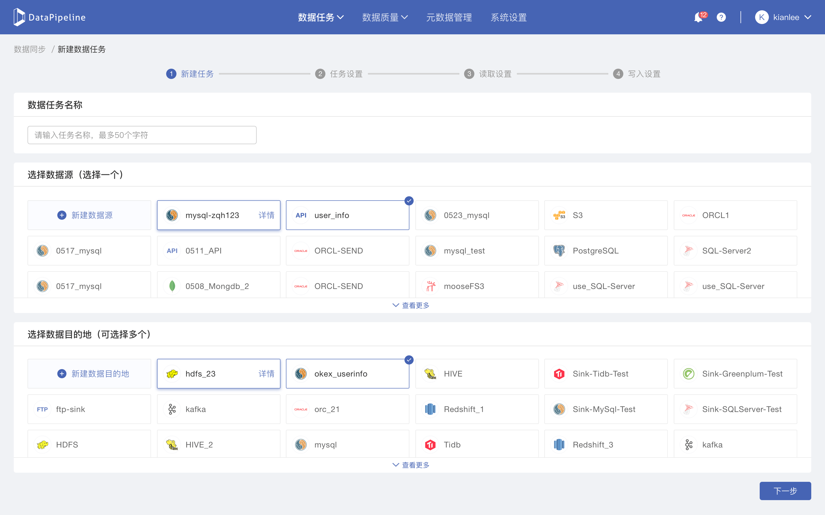 * 配置完成后,用户可以点击选择需要的数据源和目的地。可以选择一个数据源,一个或多个数据目的地。