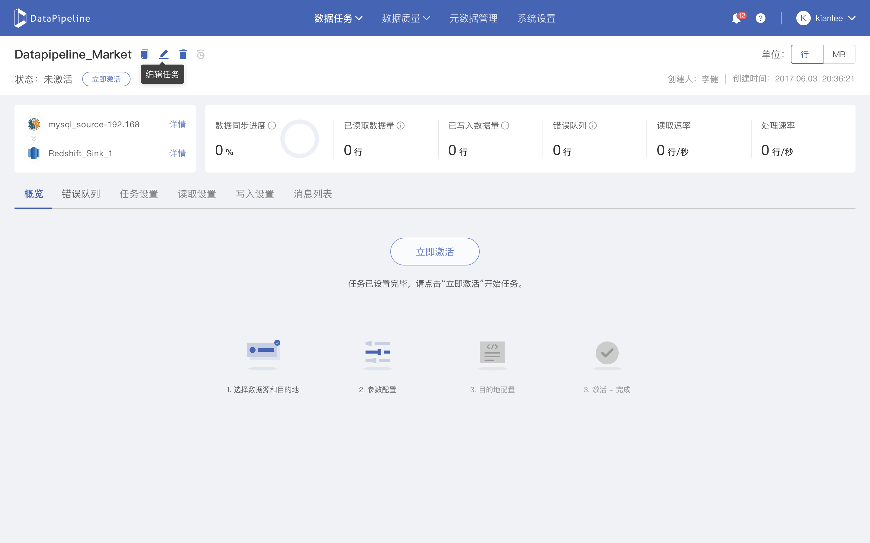 * 在这个页面,用户需要对任务进行个性化的配置,在这个页面支持对任务参与人、数据源设置、数据目的地设置以及错误队列和邮件通知等详细的内容进行设置。