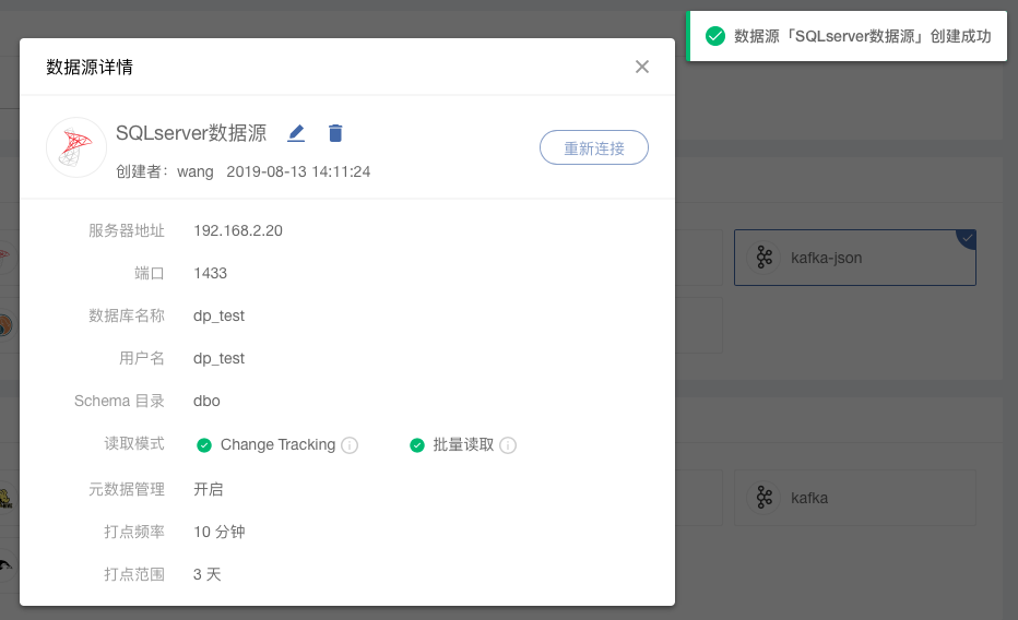 * 点击重新连接,系统将重新按照配置内容重新连接数据源检测各个信息。