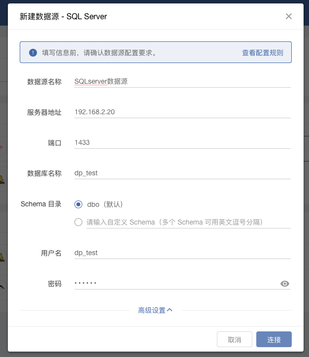 在进行配置之前,请务必检查您的SQL Server数据源是否符合平台要求,参考如下: