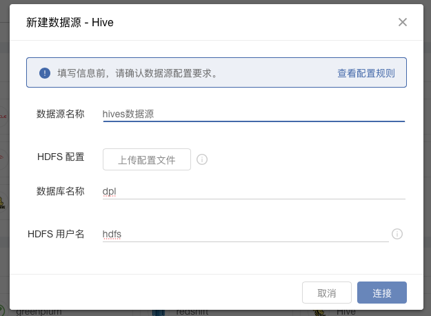 在进行配置之前,请务必检查您的Hive数据源是否符合平台要求,参考如下: