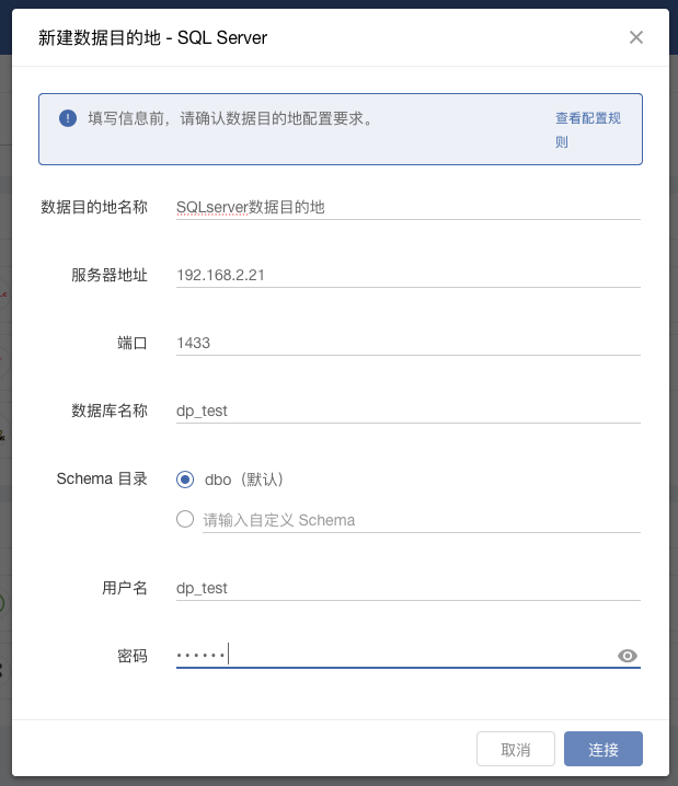 在进行配置之前,请务必检查您的SQL Server数据目的地是否符合平台要求,参考如下: