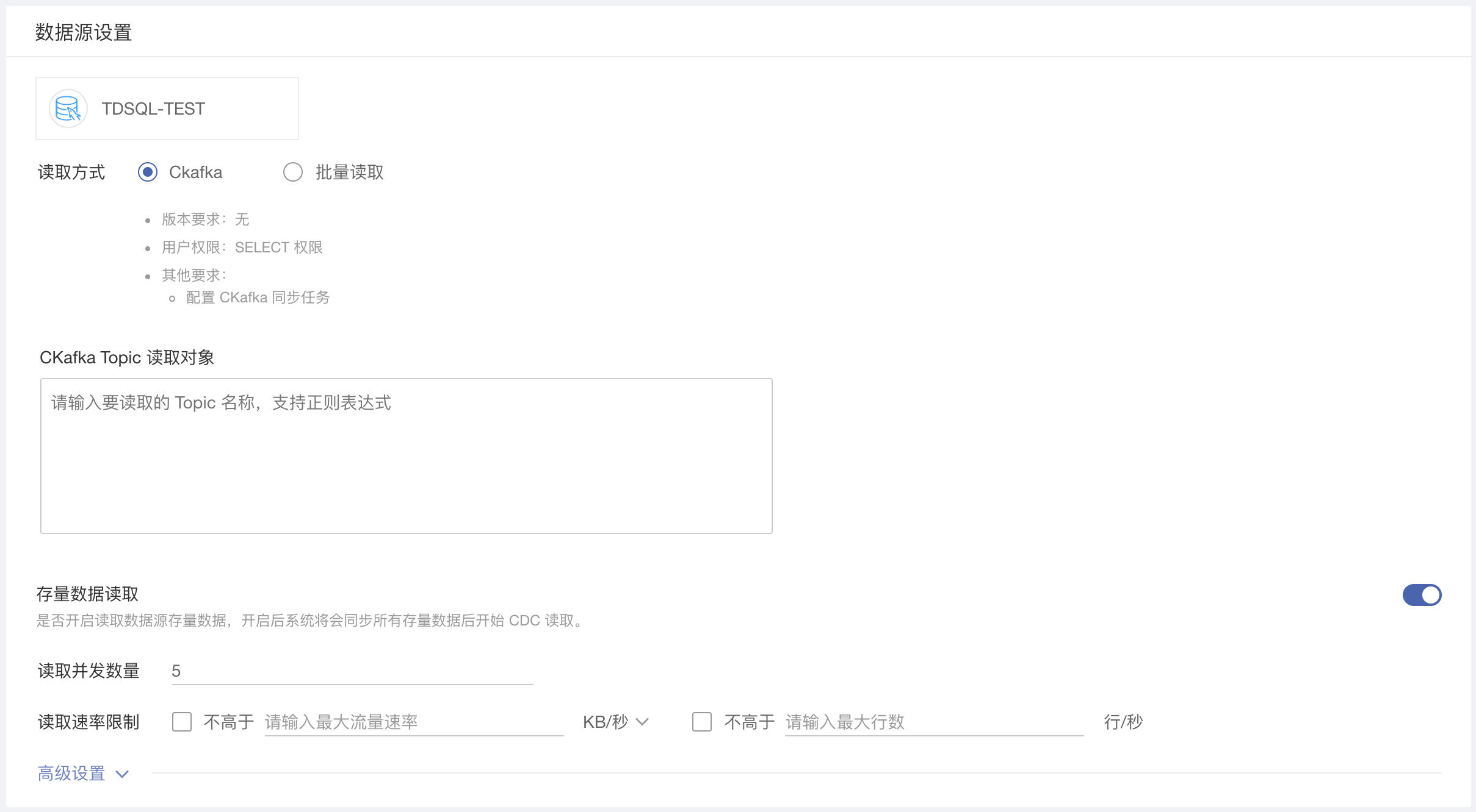 * 若用户在同步Ckafka实时同步数据前要迁移该数据库存量数据,可开启「存量数据读取」。激活任务后系统将通过SELECT \* FROM table\_name方式(读取设置步骤可以添加WHERE语句)读取存量数据,完成存量数据同步后再进行Ckafka读取模式。