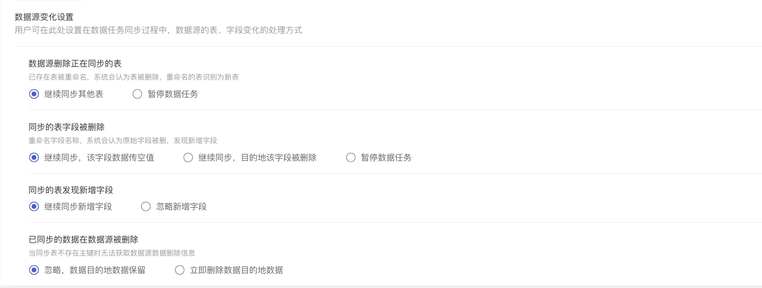 用户可在此处设置在数据任务同步过程中,数据源的表、字段变化的处理方式。
