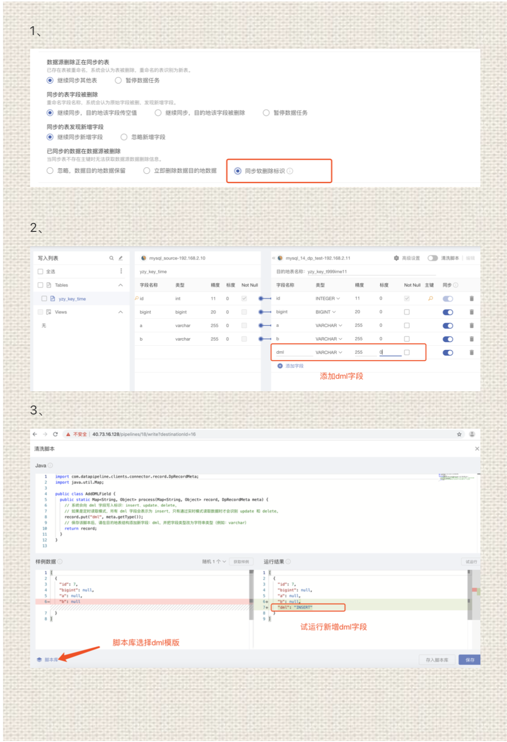 | SQL类型(mysql、oracle、sqlserver) | HBase|实时| ①数据源删除正在同步的表 ②同步的表字段被删除 (不支持继续同步,目的地该字段被删除) ③同步的表发现新增字段 ④已同步的数据在数据源被删除;|②同步的表字段被删除: a. 继续同步,目的地该字段传空;b. 暂停数据任务