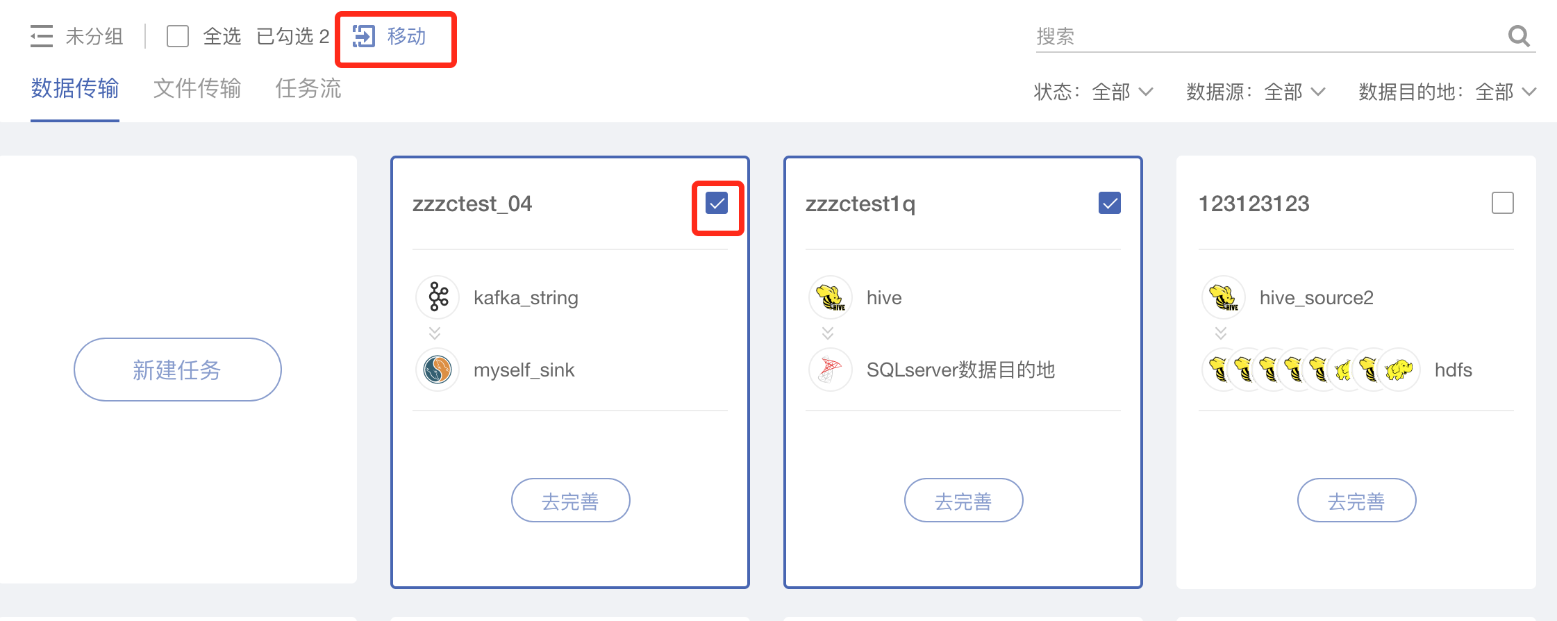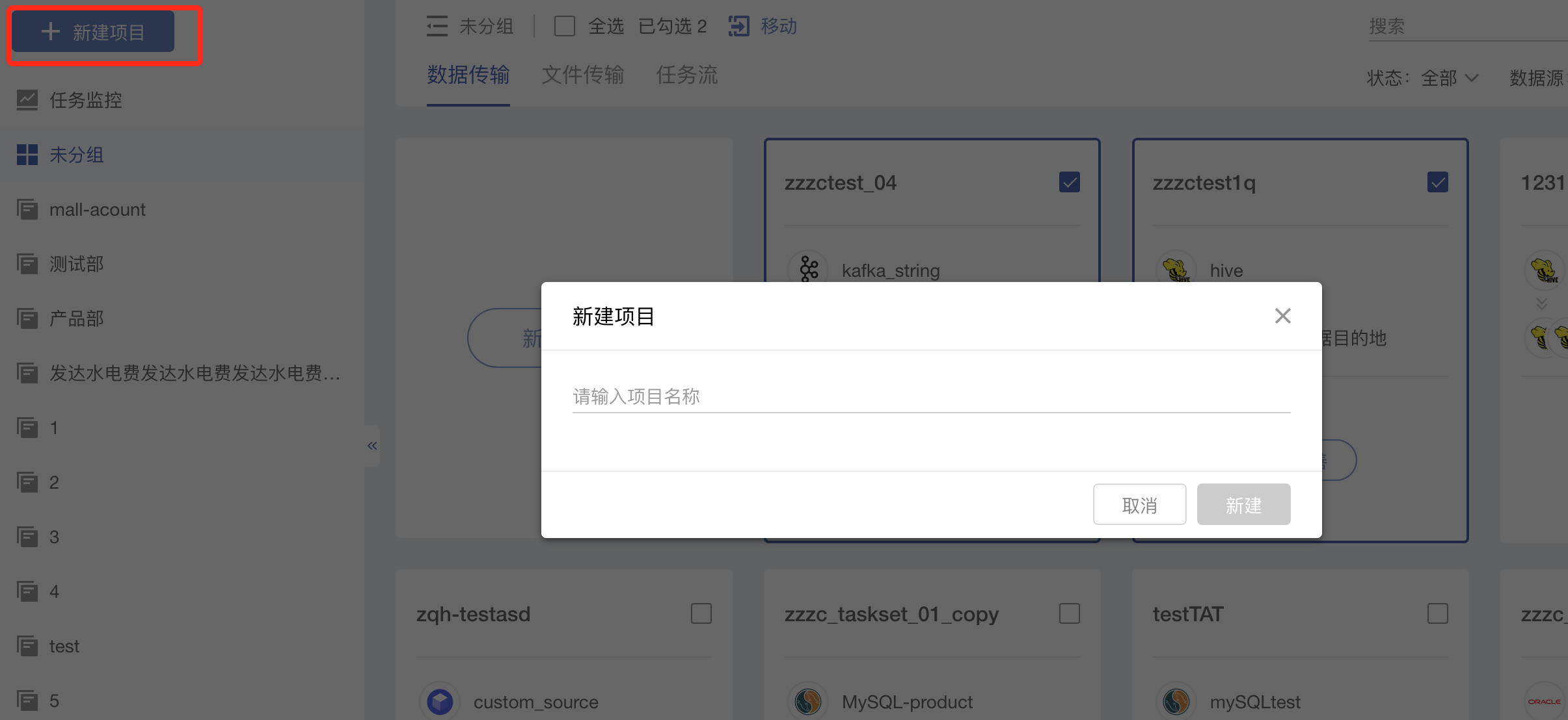 * 数据任务分组可以将数据传输任务、文件传输任务、任务流按照项目进行分组,以方便任务管理
