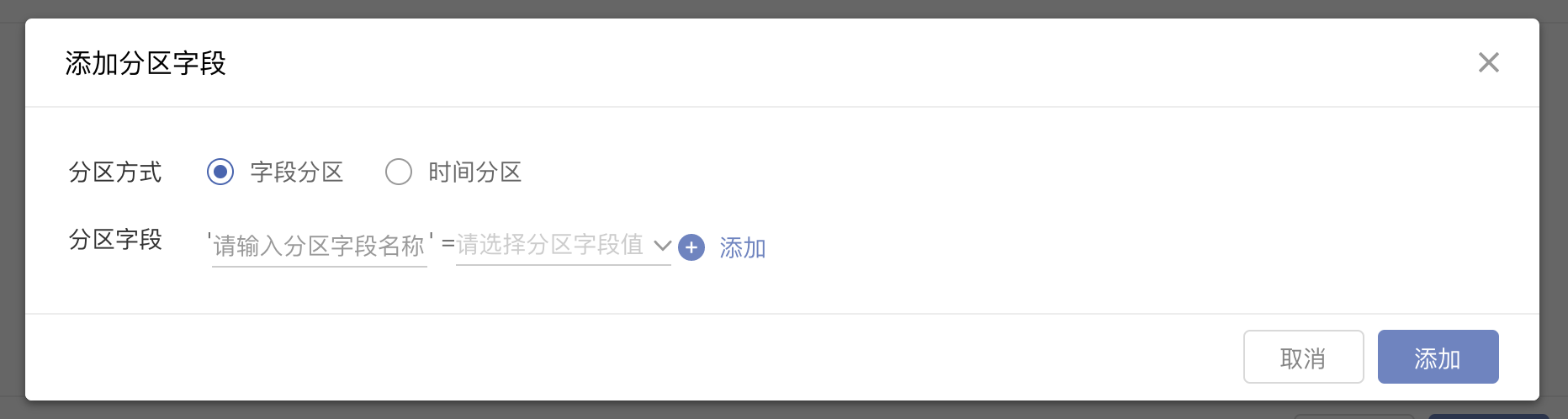 * 点击右上角「X」,标识关闭本次添加分区字段操作。