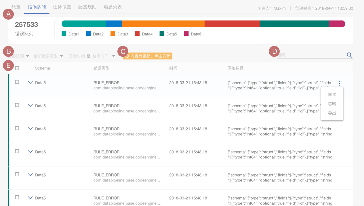 * 操作按钮:当用户鼠标悬浮或选中单条错误内容时,将出现操作按钮,用户点击可以选择对数据内容进行的操作,目前支持重试、忽略和导出。