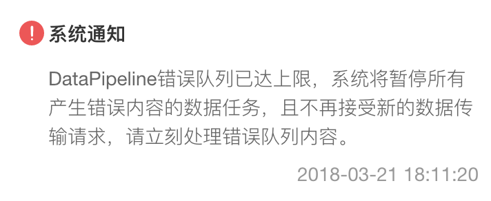 * 当数据任务的错误队列不为空且到达一定数量时,会第一时间在[**通知中心**](../yun-wei-guan-li/shu-ju-ren-wu-lie-biao.md)和和对应任务的[**消息列表**](../yun-wei-guan-li/xiao-xi-lie-biao.md)提醒用户任务存在错误队列,让用户快速了解数据任务的错误情况。