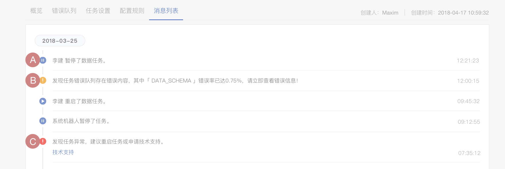 为帮助用户更好的管理数据任务,DataPipeline提供消息列表,记录关于该数据任务的所有操作信息和错误通知信息。