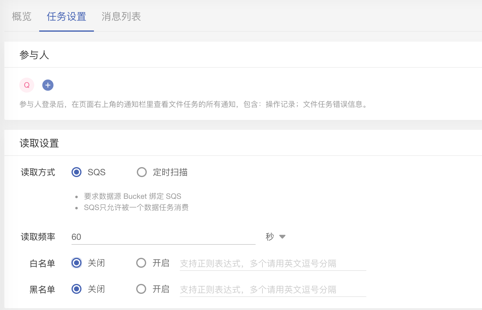 创建「文件同步任务」第二步中,用户可以对任务进行个性化的配置,在这个页面支持对任务参与人、读取频率以及白名单、黑名单等详细的内容进行设置,增加任务的灵活性。