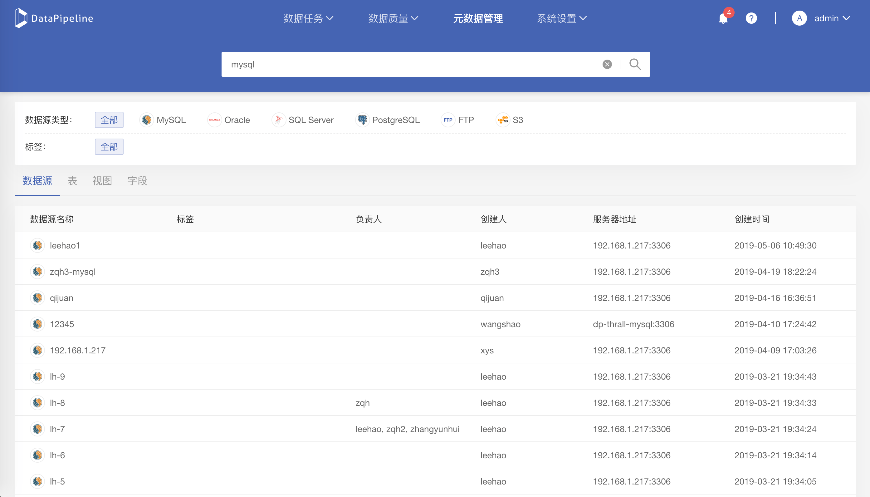 * 内容:数据源名称(logo+名字)、标签、负责人、创建人、服务器地址、创建时间