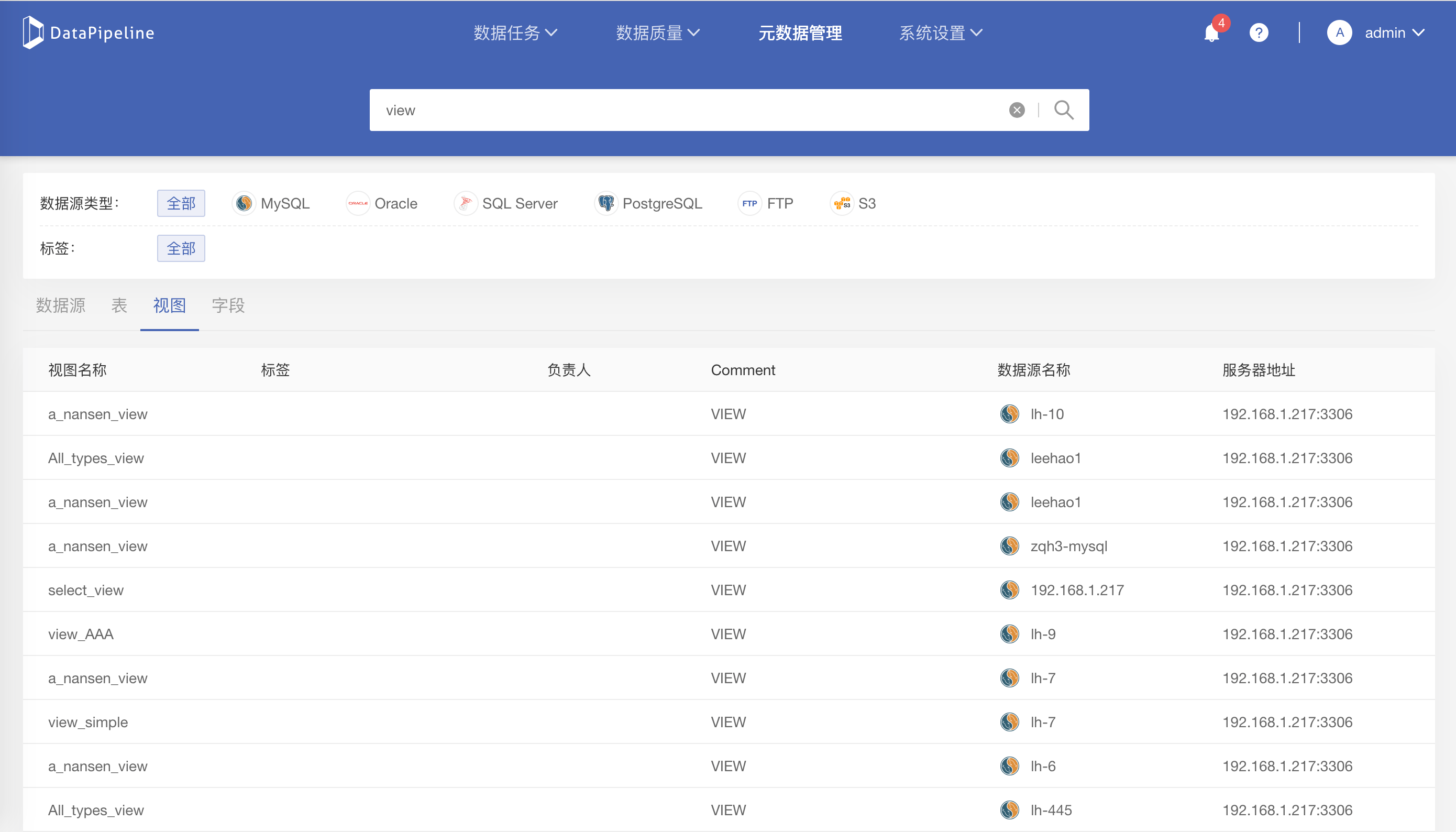 * 内容:视图名称、标签、负责人、Comment、数据源名称(logo+名称)、服务器地址
