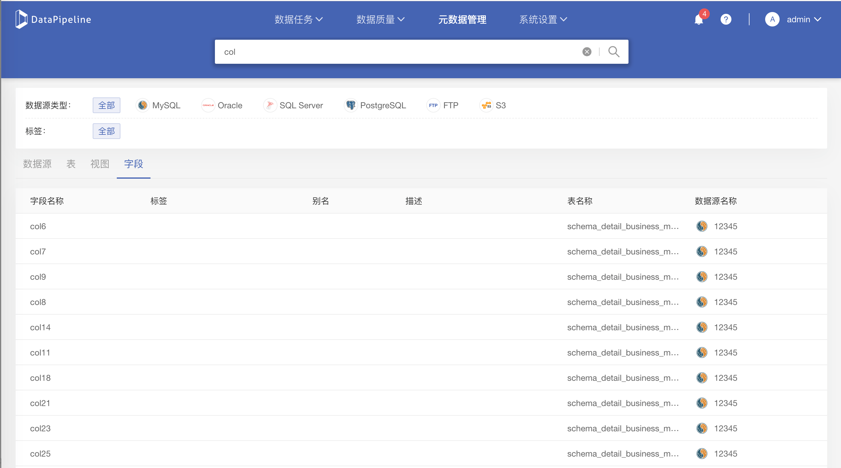 * 内容:字段名称、标签、别名、描述、表名称、数据源名称(logo+名称)