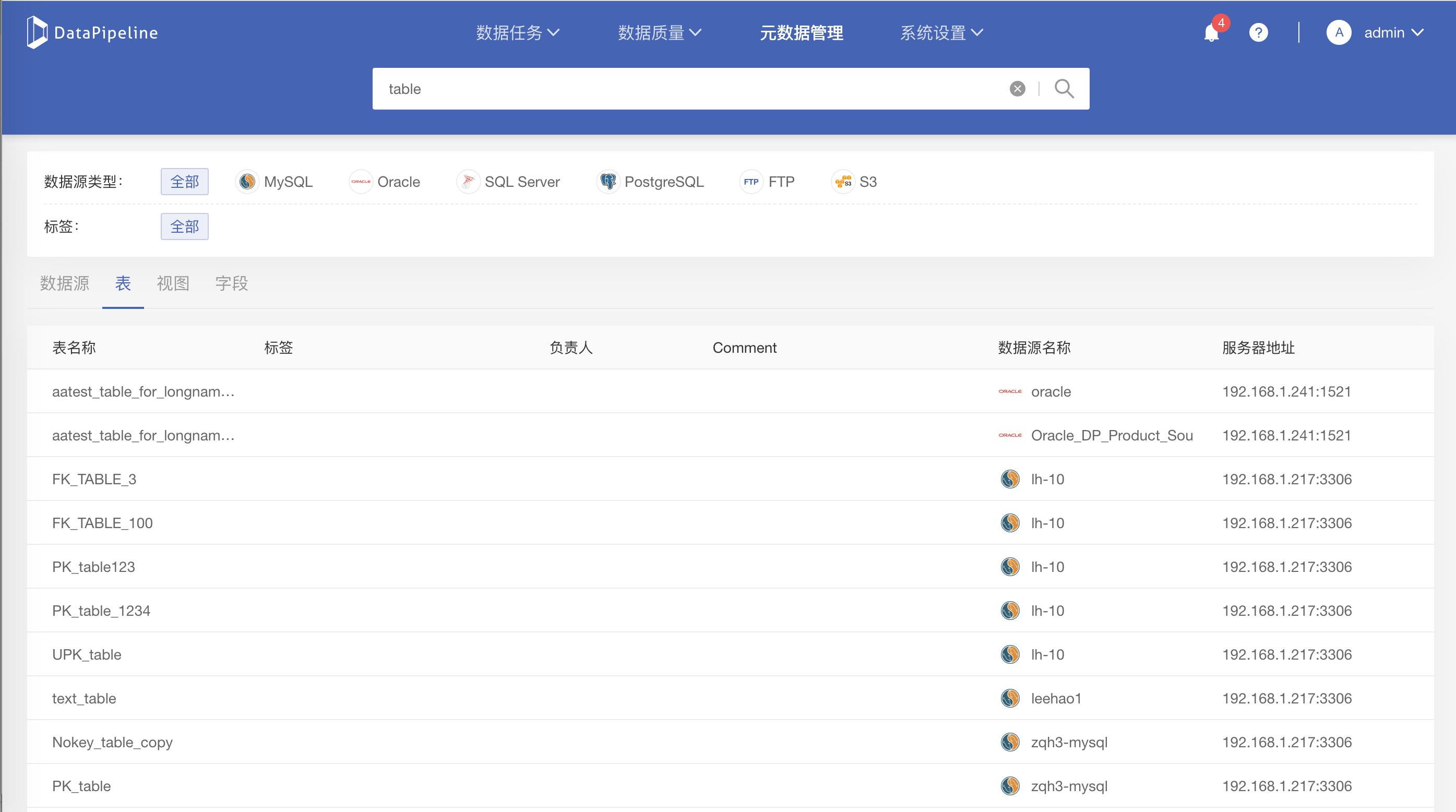 * 内容:表名称、标签、负责人、Comment、数据源名称(logo+名称)、服务器地址