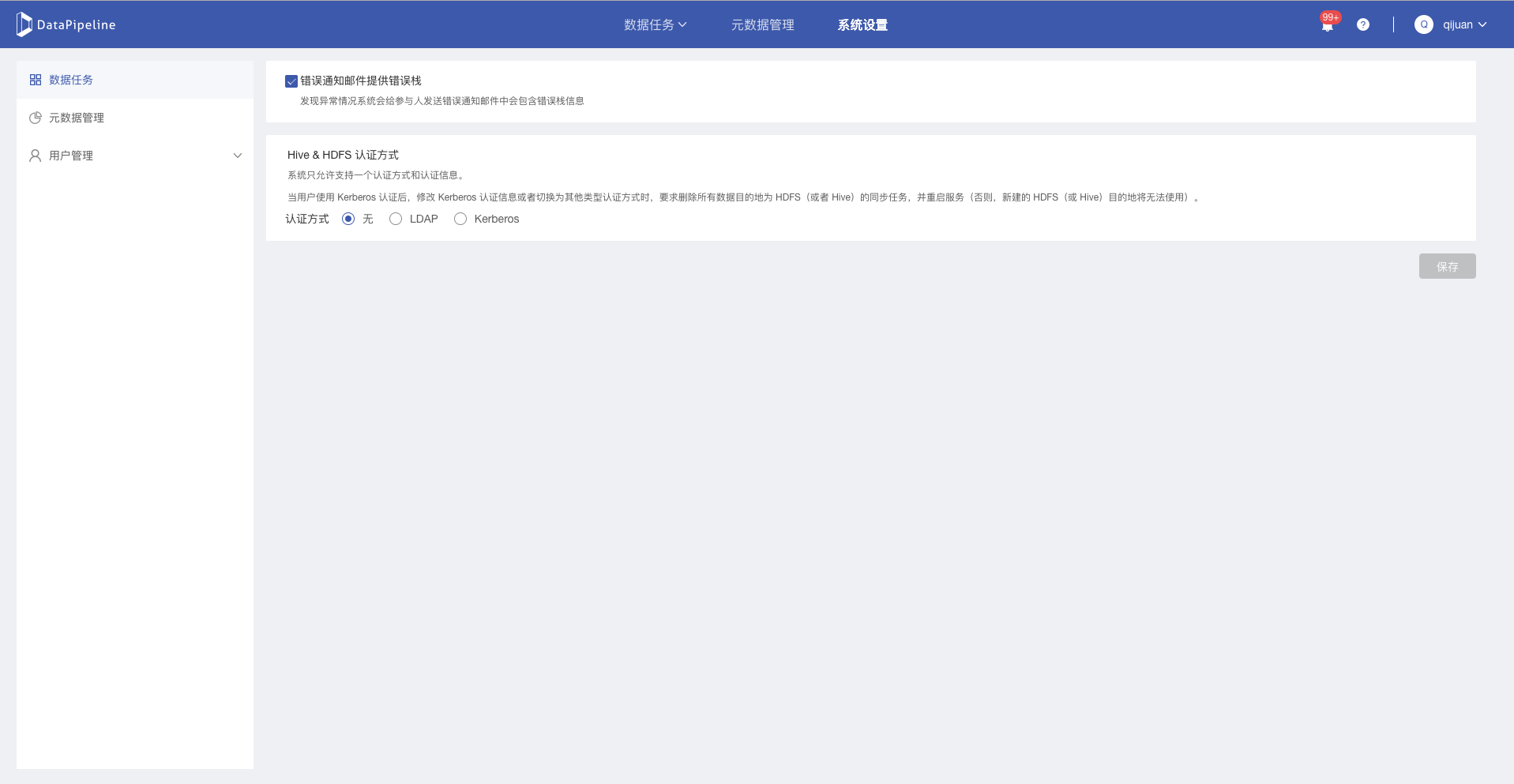 * 当用户使用Kerberos认证后,修改Kerberos认证信息或者切换为其他类型认证方式时,要求删除所有数据目的地为HDFS(或者Hive、HBase)的同步任务,并重启服务,否则,新建的HDFS(或Hive)目的地将无法使用。