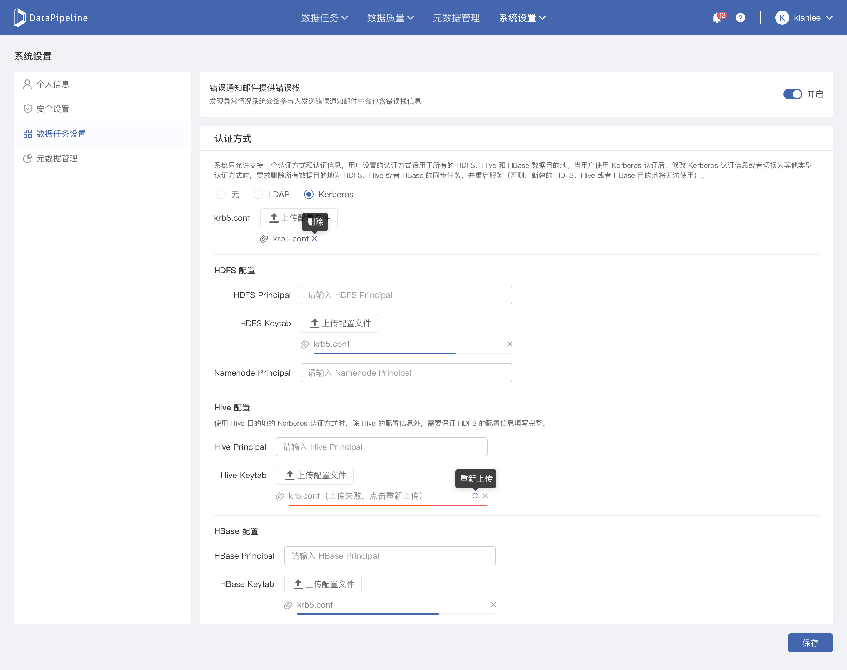 * 填写上HBase Principal 之后,需要上传HBase Keytab,提供一个「上传配置文件」入口。