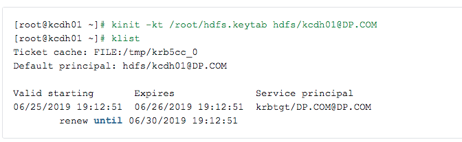 # kinit -kt /root/hdfs.keytab hdfs/kcdh01@DP.COM