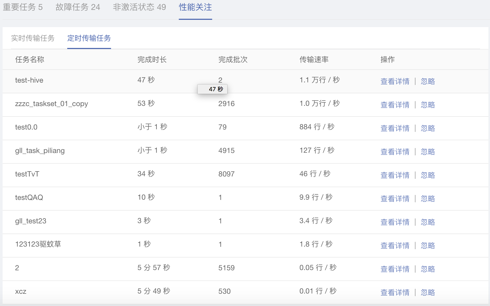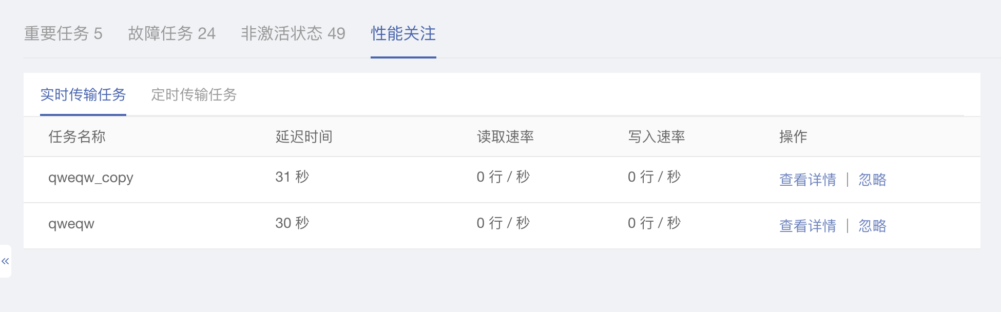 内容:任务名称、延迟时间、读取速率、写入速率、「查看」按钮、「忽略」按钮。