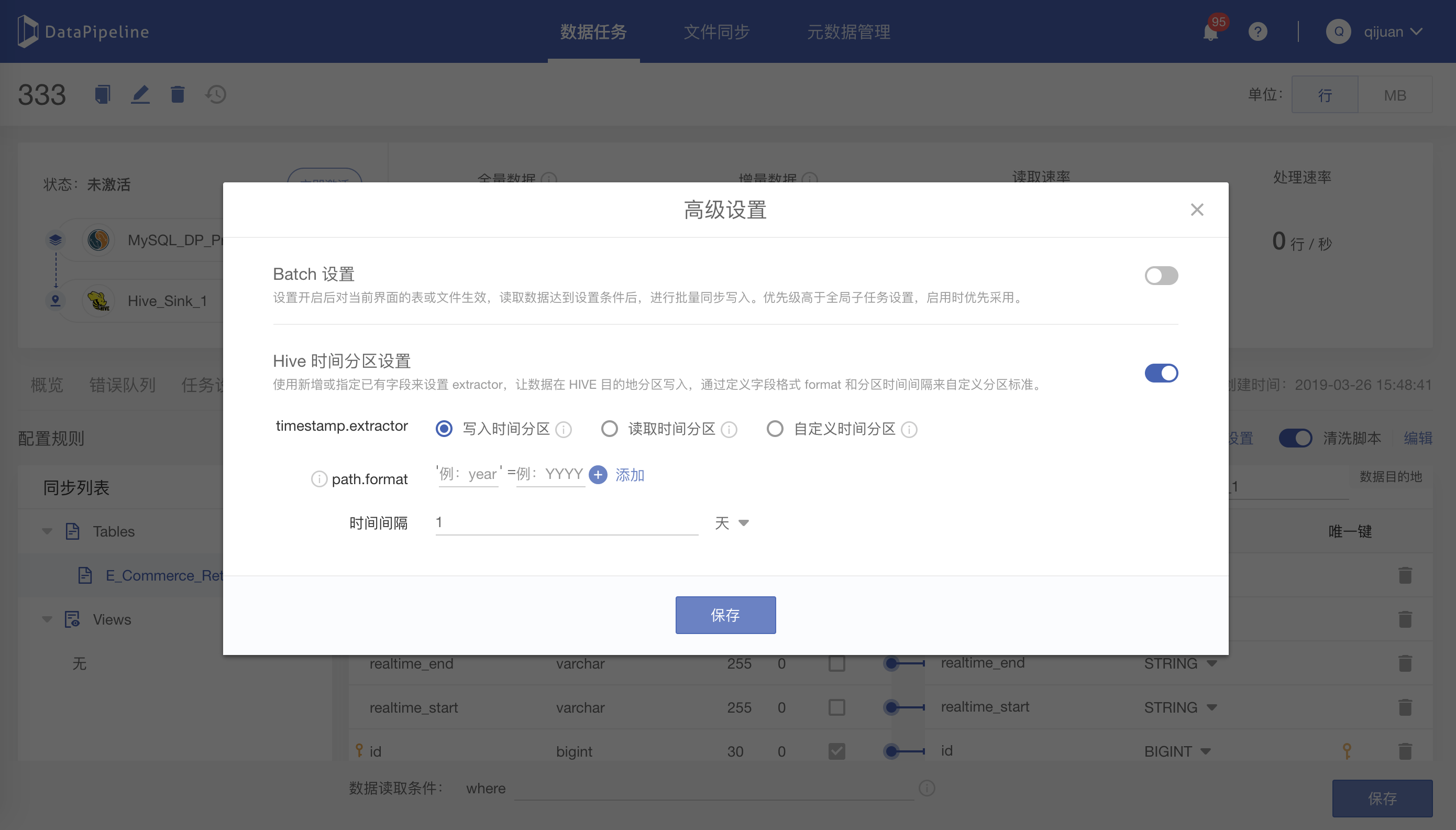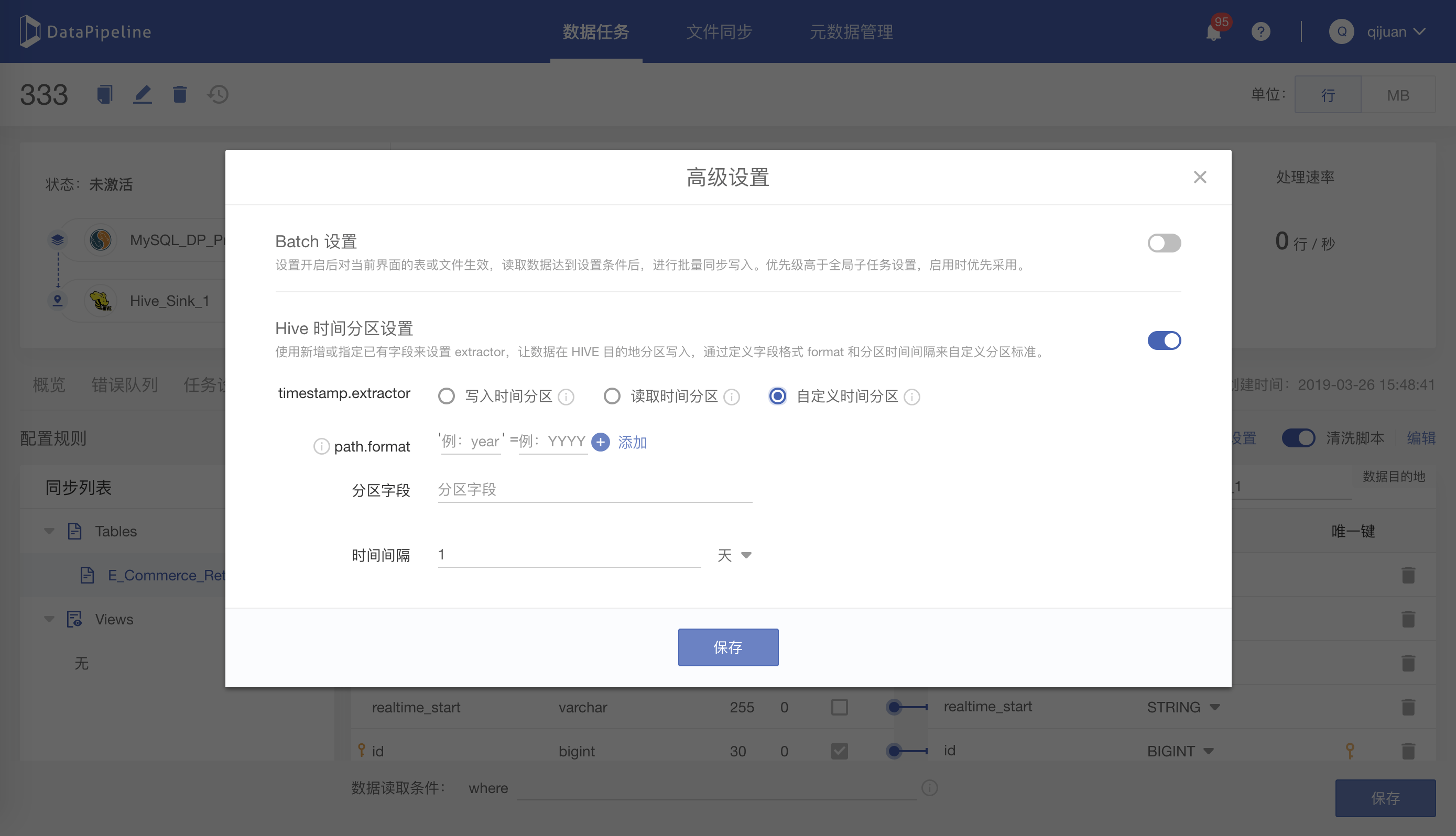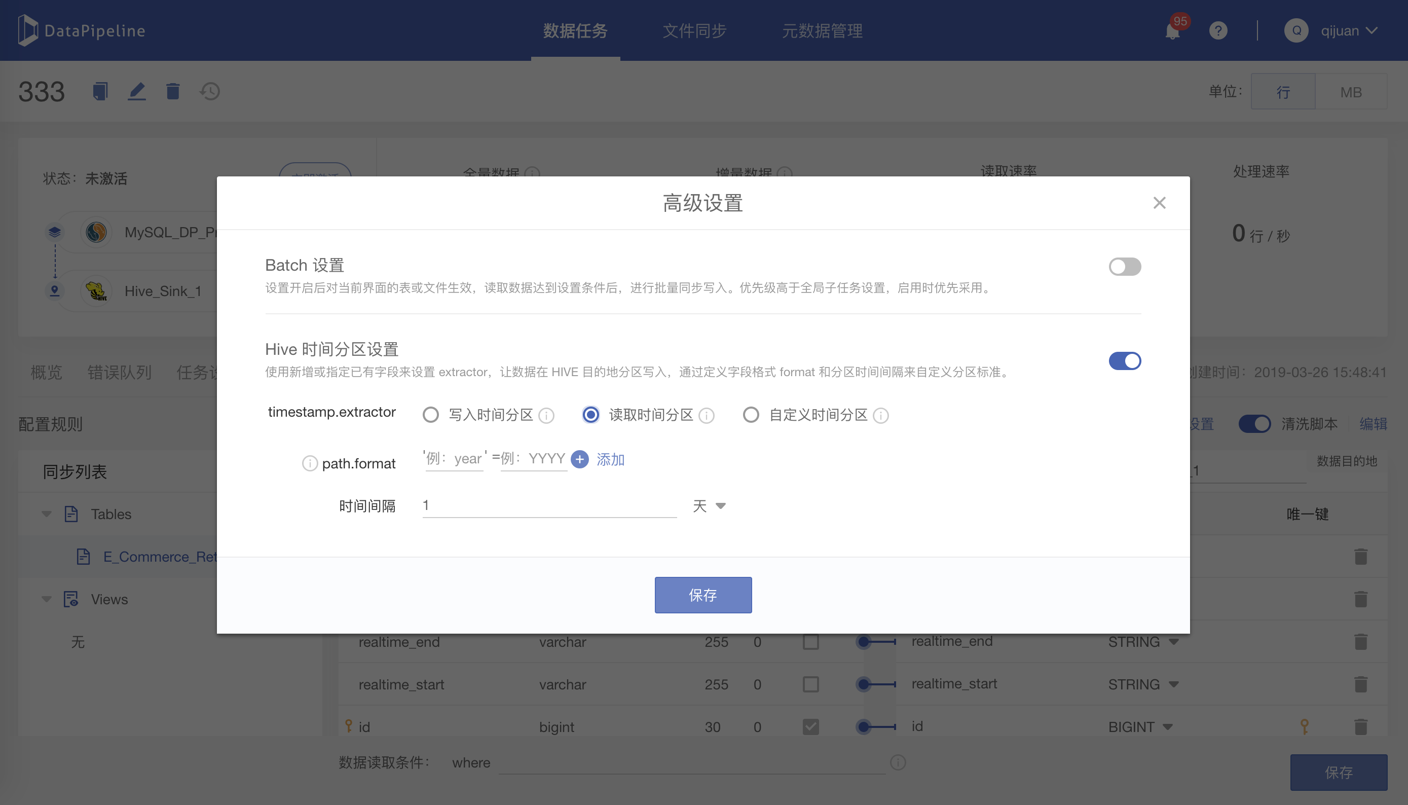 * 开启Hive后,支持用户在配置规则界面进行高级设置,高级设置可以用于设置时间分区,以完成数据清洗。