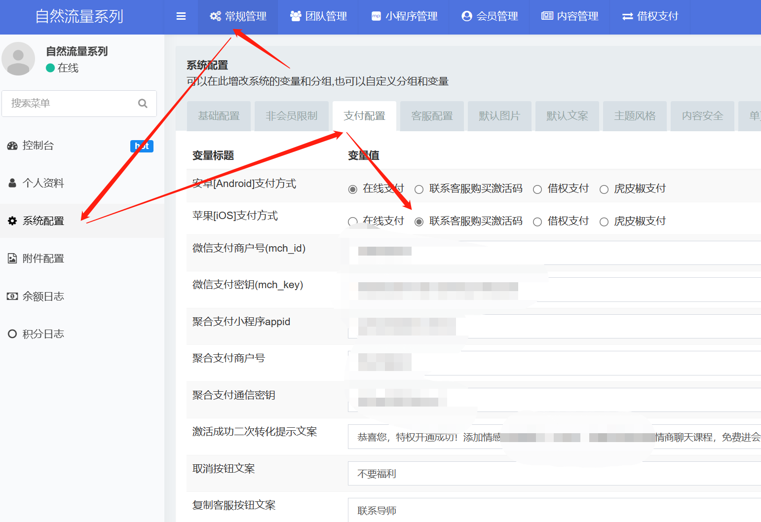 1. 登录租户后台,【常规管理-系统配置-支付配置-苹果支付方式】改为【联系客服购买激活码】