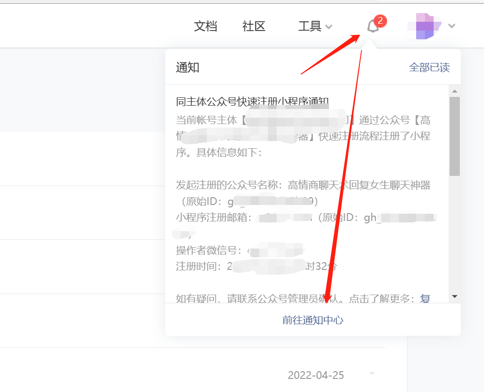 1. 登录微信小程序官方后台:[官方后台链接](https://mp.weixin.qq.com),点击右上角的【铃铛-前往通知中心】