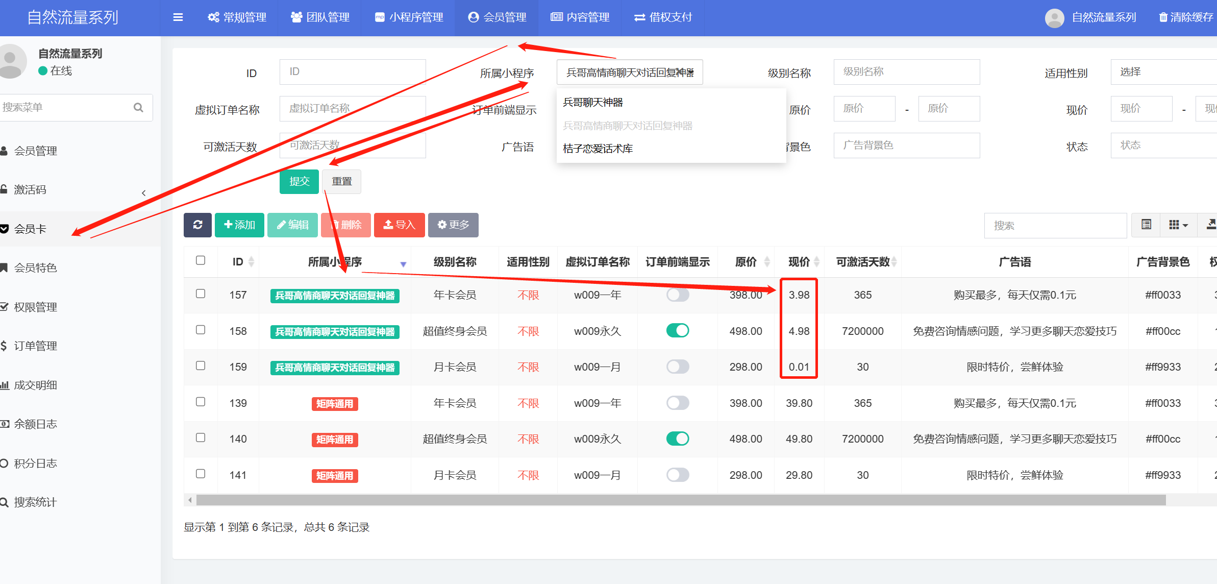 2. 进入【会员管理-会员卡-筛选所属小程序-点击最右边的修改】修改会员卡价格