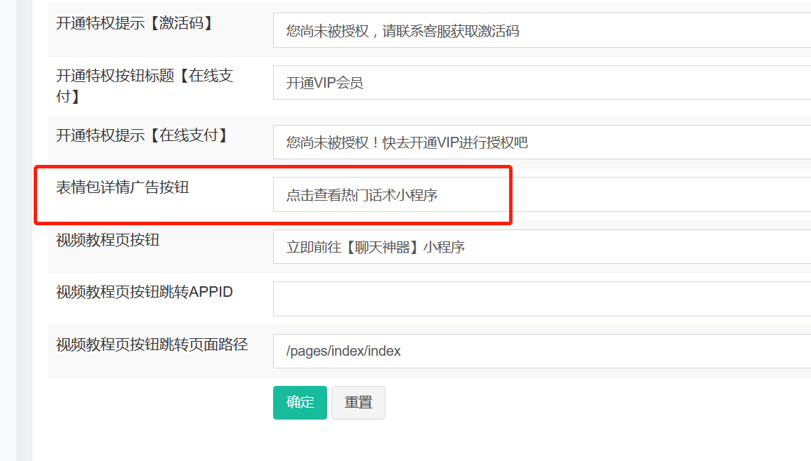 1. 前往租户后台:常规管理-系统配置-默认文案,找到:表情包详情广告按钮,填写按钮文案