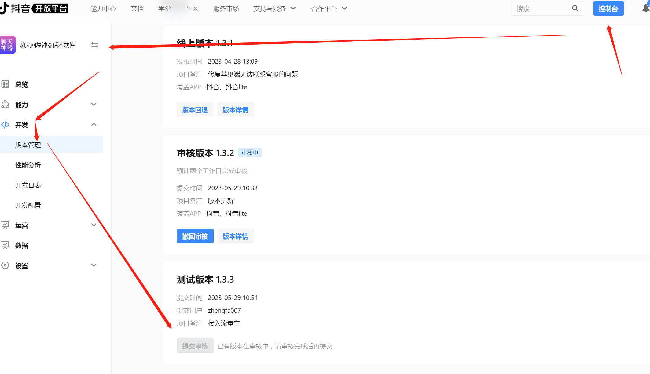 7. 登录抖音开发者后台-控制台-点击相应的小程序-开发-版本管理-测试版本,在扫码体验正常可以浏览数据之后,可以提交审核